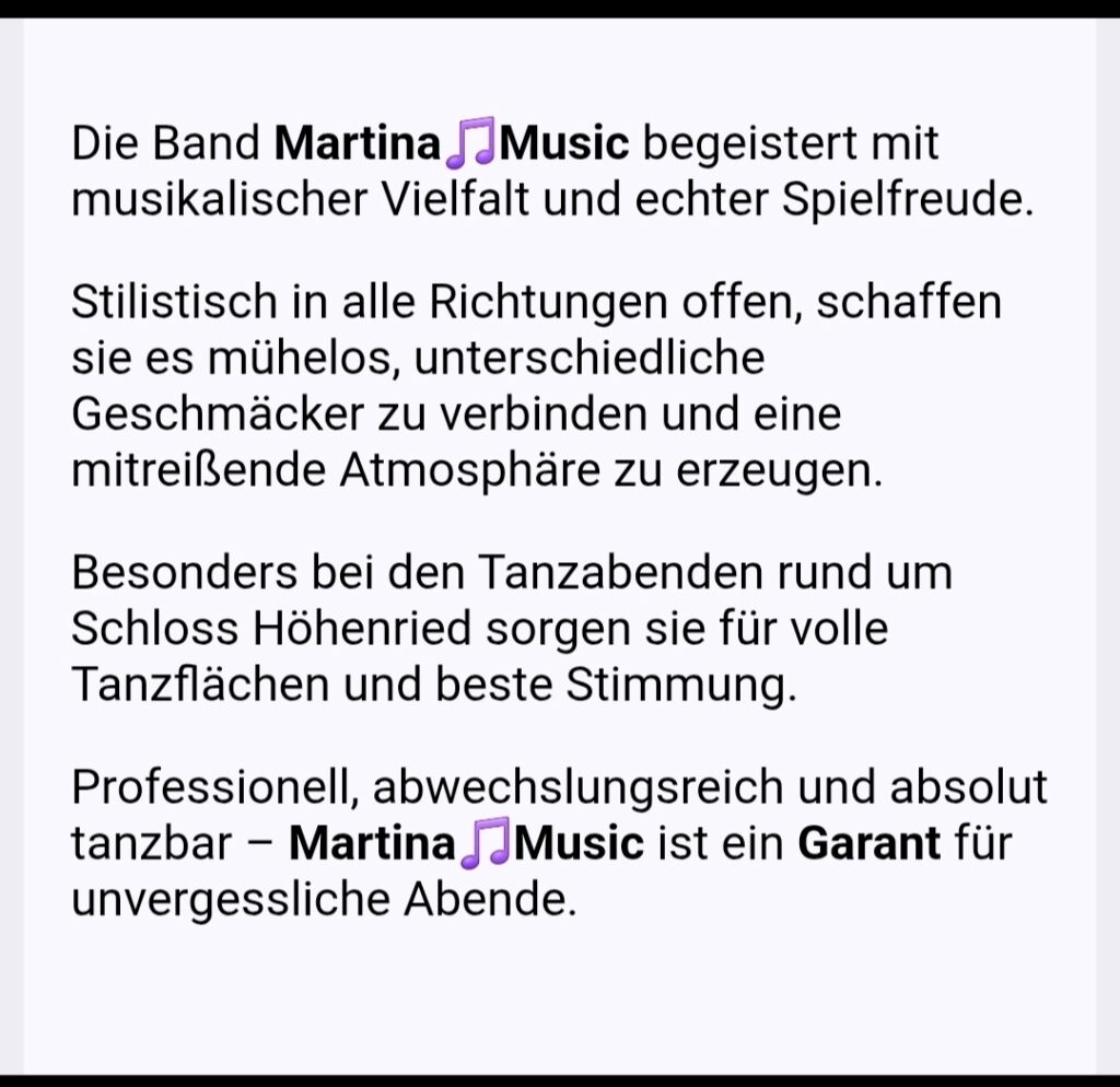 Unser Repertoire ist vielfältig und reicht von gefühlvollen Balladen bis hin zu mitreißenden Partyhits für alle Generationen aus allen Genren.
